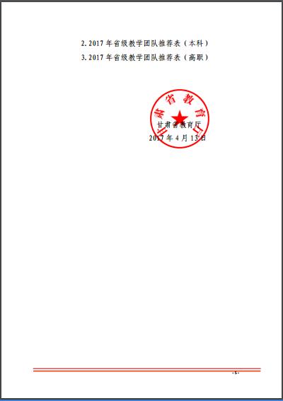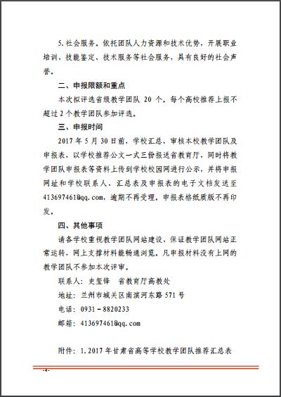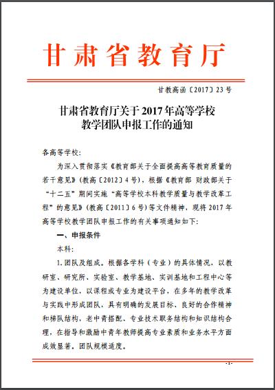 附件:1.2017年甘肃省高等学校教学团队推荐汇总表2.2017年省级教学团队推荐表(本科)3.2017年省级教学团队推荐表(高职)